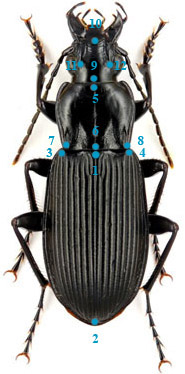 Materials and methods. The design of our study was organized as follows: (1) we study the intraspecific variation of body size in carabids, bearing in mind that closely related species could act very differently, each individual species following or countering Bergmann's Rule in its own way; (2) in all studied species the same six traits were measured; (3) we used linear models to isolate concretely latitude effects (but not another environmental factors) to traits variation; (4) beetles were sampled in the same space over the vast regions covering their ranges. Six carabid species from different regions of Russia were analyzed. Linear models were applied to quantify contribution of region’s latitude where beetles had been sampled into that variation. We applied voice-counting method to reveal trends of traits size variation in latitude gradient and relative warp analysis (a principal component analysis of the weight matrix) when analyzing effect of latitude on body shape shifts in studied species of carabids.