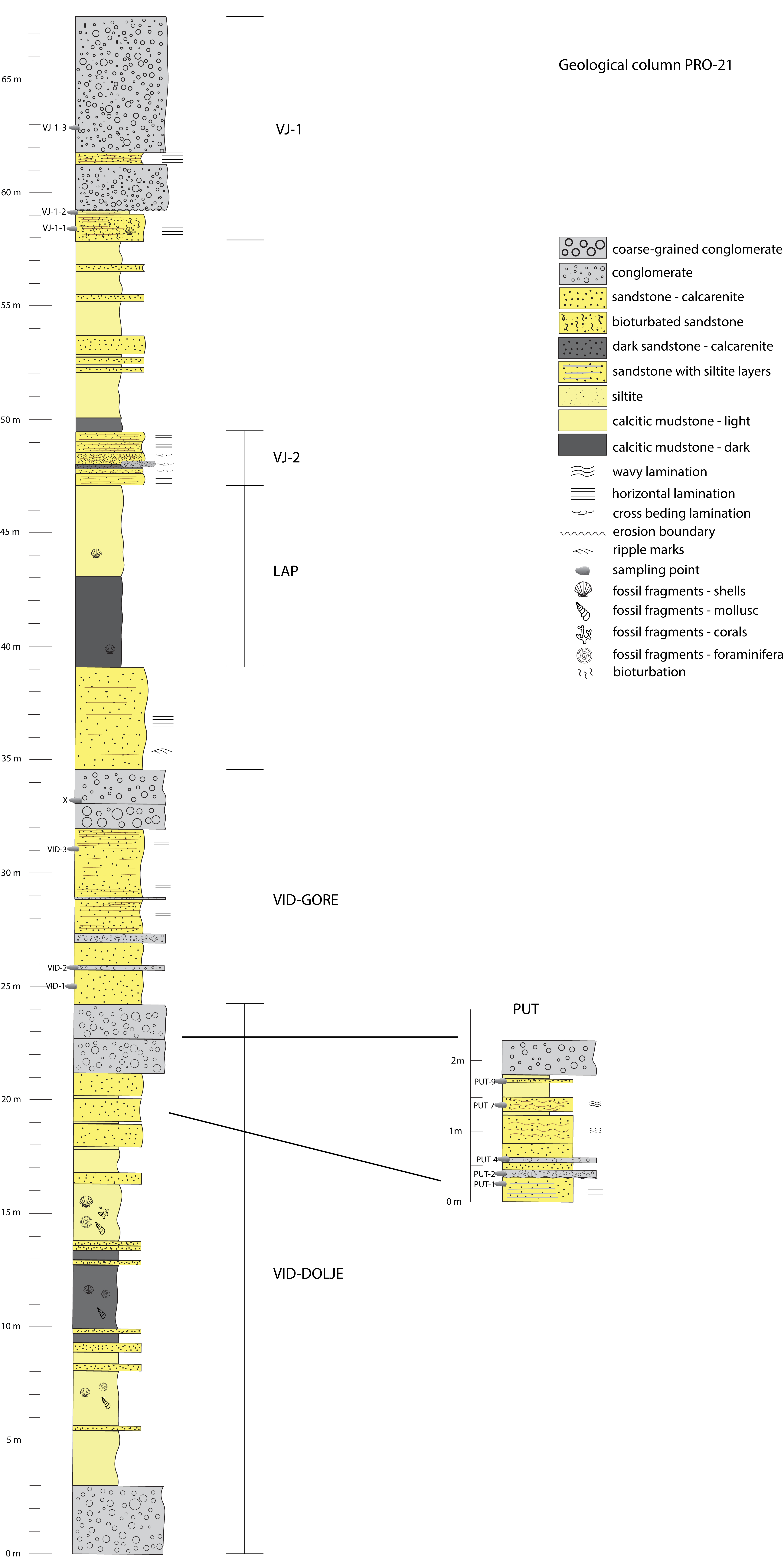 Clastic deposits from the upper part of the Promina Beds, situated at the top of Promina Mt. (External-Karst Dinarides) in Croatia, were investigated. The aim of this study is to present and promote geological peculiarities of the Promina Mt. and its surroundings. Sedimentary succession in the study area comprises 3 lithofacies types, as the main findings of this study: carbonate conglomerates, calcarenites and calcareous mudstones. The results obtained by the combined field recording of the sedimentary succession and micropetrography are presented in the lithological column PRO-21, showing the determined lithofacies types and their characteristics. Attributed shelf to delta sedimentary environments were further discussed.
